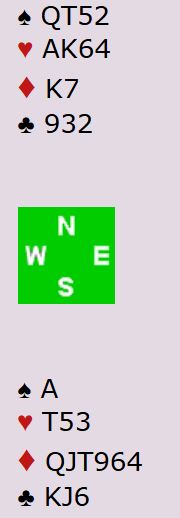 Her tar vi med et spill hvor nesten samtlige bord spilte samme kontrakt, 6NT som i praksis er ganske nedlegg slik det sitter. Men du vet jo ikke hvordan det sitter når kontrakten skal spilles. Prøv deg selv og ikke titt på det fullstendige diagrammet før du har bestemt deg for en plan: