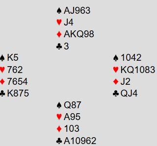 Ved det ene bordet ble spillefører ivrig da han så mønsteret for eliminasjon! Han stakk utspillet og trumfet en kløver med det samme. Så et par runder trumf og nok en kløver til stjeling før det ble spilt hjerter. Nord stakk med esset andre gang og fridde seg med en hjerter. Da måtte det bli bet siden hele spillet så slik ut: