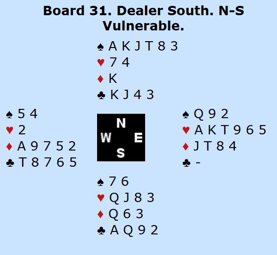 Ved det andre bordet ble det spilt trumf til knekten, over på kløver ess og trumf dame. Da ble det trumftaper siden vest fikk dekket med singel konge i andre trumfrunde, og østs tier voks opp til stikk. Spillefører var fortsatt ikke fortapt og ville vunnet om øst satt med trekorts ruter siden spillefører i så fall ville rukket å bli kvitt syds småhjertere. Spillefører i gang med ruteren, men øst kunne trumfe tredje gang med tieren og innkassere hjerterstikket. En bet, og 17 IMP i sving,