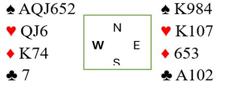 Vest må nok ha spar konge hvis dette skal ordne seg. Inne på hjerter ess må det spilles trumf. Men hvordan bør trumfen behandles? Liten til knekten fulgt av esset er en mulighet, og da kan trumftaper unngås om vest har spar konge dobbel. Men skjer det er det fortsatt mulighet for to tapere, en i hver rødfarge. Men at at det ikke blir rutertaper er det jo en bra sannsynlighet for.