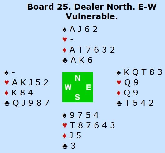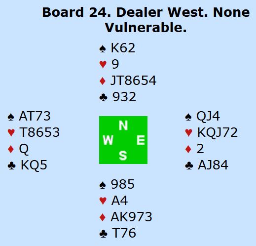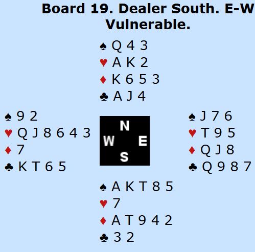 Resultatene viser at åtte av 48 N/S par noterte +300, og de fikk +29 på spillet av 46 mulige poeng. Bedre N/S score ble det for dem som noterte +420. De fire parene som vant 4 hjerter fikk +41. Toppen N/S gikk til et par som fikk inn +500 mot en ganske grusom 5 spar doblet som gikk tre bet. Det var også flere delkontrakter, og noen som fikk spille 5 ruter udoblet samt noen som var i 5 hjerter og gikk bet etter at Ø/V hadde vært med til 5 ruter. Toppen Ø/V gikk til et par som tok inn +500 mot 5 hjerter doblet. Spillefører bommet hjerteren og fikk kun ni stikk.