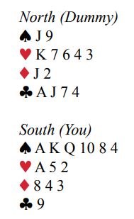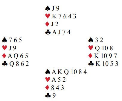 Hvis ikke hjerteren sitter 3-2 kan ikke denne utgangen vinnes om motspillerne spiller bra motspill. Men med 3-2 sits i hjerter er det ti enkle stikk hvis det spilles liten hjerter fra hver hånd i andre stikk. Om de kontrer med ruter kan den tredje ruteren trumfes hos nord. Samme hva de spiller annet enn ruter kommer spillefører inn og tar ut trumfen, så innkasseres hjerterstikkene med overgang i fargen. Om de ikke tar de to ruterstikkene blir det med den spilleføringen og denne sitsen elleve stikk!