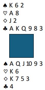 Etter 2 passer åpner Øst med 3 kløver foran deg. Du velger å gå inn med 3NT, som kan virke litt hasardiøst mot en makker som har passet i åpning, men som egentlig ikke er så risikabelt siden motparten umulig kan straffedoble etter denne starten på meldingsforløpet. Det går pass rundt, og Vest starter med spar Konge. Øst følger med åtteren, og hva gjør du?
