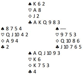 Da spillet forekom i en lagkamp ble kontrakten 6 spar spilt av syd ved begge bord. Kontrakten ser opplagt ut, og den ene spilleføreren gikk for fart fremfor forsiktighet. Han tok første stikk med hjerter konge og tok ut trumfen i fire runder siden vest hadde alle de fire uteværende trumfene. Så gikk han i gang med kløveren. Om den hadde vært fordelt 3-3 ville det vært helenkelt (13 stikk), og om kløverfargen satt 4-2 kunne det settes opp to ekstra kløverstikk ved å stjele en kløver. De stikkene kunne hentes med hjerter ess som inntak. Alt i alt gode sjanser, men så satt øst med femkorts kløver. Da var det bare 6+2+0+3 = 11 stikk, og han måtte håpe ruter ess satt foran kongen. Etter tre store kløvere med to ruteravkast fulgte ruter til kongen. Da ble det bet med to rutertapere siden det satt slik fra start: