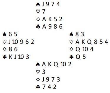 N/S sine kort er vel ganske greie å melde om man får melde i fred. Men etter vests 2 ruter i åpning er det ikke så enkelt. Italienerne var altså i 6 spar som greit ble vunnet. Ved det andre bordet fant ikke Norge frem til slem etter at nord hoppet til 4 kløver over vests 2 ruteråpning. 4 kløver var såkalt Leaping Michaels (kløver + spar, minst 5-5). Der stoppet meldingene, nord visste ingenting om syds kort som kunne vært helt uten verdier. Italia vant 11 IMP på spillet som et bra bidrag til å vinne kampen med hele 40-3.