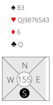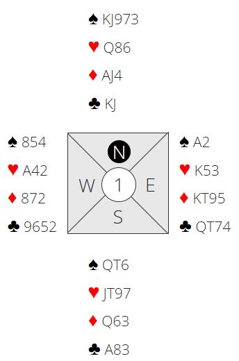 N/S har 24 HP til sammen. De fleste åpner med 1NT (15-17) med nords kort. Da spørs det om syd melder utgang, eller inviterer med sine 9HP og et par tiere. I lagkamp synes jeg å si 3NT med syds kort er greit. I parturnering er det vel ikke så galt å invitere til utgang. Og i lagkamp kan det hende mange ville tatt i mot en eventuell invitt med nords kort selv om det er kun 15 poeng, for den femte sparen gir fort ett ekstra stikk.