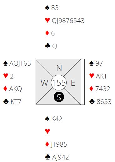 Singeltonutspill er selvsagt alltid aktuelt mot trumfkontrakt. Men her har du to singeltoner og må velge om du da ikke gir opp det utspillsvalget og spiller ut hjerter dame. Slik så hele spillet ut: