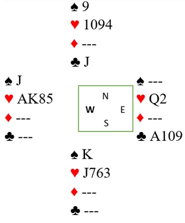 Nå spilles hjerter til damen og kløver ess. Syd er ferdig, enten må han gi opp hjerterholdet eller kaste spar konge. Det kastes fra vest etter at syd har gjort seg ferdig. Spillefører behøver egentlig ikke tenke, eller telle særlig mye her. Han vet jo syd har spar konge og behøver kun å se om syd kaster det kortet. Gjør han ikke det forsvinner spar knekt og hjerteren prøves fra topp. Og da går hjerteren...tretten stikk!