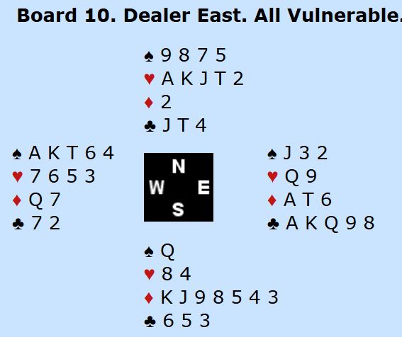 Ved det andfe bordet ble øst (Kvangraven) spillefører. Syd spilte ut kløver! Dermed var det elleve enkle stikk, Norge +650 og 13 IMP inn.