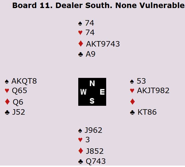 Damelaget røk også ut i siste kamp. Etter to jevne kamper tidligere på dagen mot Nederland og England, trengte de en stor seier over lavt plasserte India for å kunne gå til kvartfinalen. Men når du presser på for å få svingspill din vei, resulterer det ofte i selvmål isteden. India vant klart og sendte Norge ned på 10.plass - ikke minst takket være dette spillet. Torild Heskje og Gunn Tove Vist stoppet i 4 hjerter og tok 11 stikk, mens inderne ved det andre bordet meldte lilleslem etter at Øst hadde doblet en rutermelding underveis. Vest spilte ut ruter knekt, og spillefører stakk med Esset og trakk øyeblikkelig spar Konge fra bordet. Da Øst dekket med Esset, var resten lett. Syd trumfet, tok for hjerter Ess og spilte kløver Ess og kløver til stjeling. To kløvere forsvant på sparen, og alt Øst fikk var et trumfstikk.