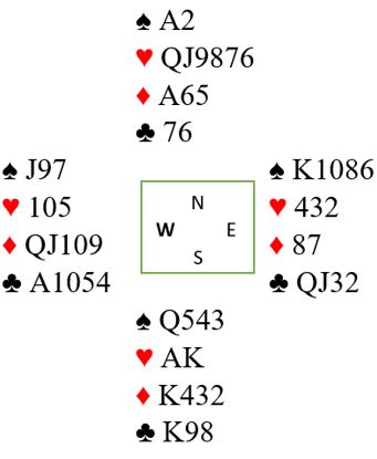Hvordan spilte du forresten i 6 hjerter? Det er greit nok å satse på kløverfargen, men den finessen kan jo tas begge veier. Så før du går på kløveren er det ganske lurt å starte med spar Konge fra bordet. Hvis Øst stikker med Esset eller begynner å nøle, godspiller du sparen til avkast av to kløvere. Og hvis Øst er så god at han klarer å legge liten spar uten å skjelve på hånden, har han kanskje fortjent å få en bet?