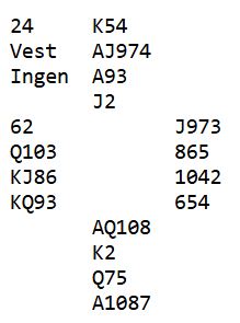 PS. Det var selvsagt mange som passet med nords kort i faresonen. Etter pass fra nord bør Ø/V ha en veldig bra sjanse til å finne frem til slem. Men om nord passer har ikke spillefører noen indikasjon på det med "ledige plasser" og hvordan trumfen bør spilles. I så fall er det "random" hvem som eventuelt har tre trumf, og å legge ned feil honnør som fører til en bet i den konteksten er bare uflaks.