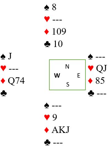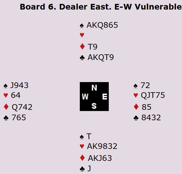 Heiberg-Evenstad og Hoftaniska var i 6 ruter spilt av vest! Og kontrakten var for sikkerhets skyld doblet. Hvis det kommer spar, ruter eller hjerter ut er det tricky, men kontrakten kan vinnes da også. Nord spilte imidlertid ut kløver ess som gjorde at det ikke var noen problemer med å vinne tolv stikk, DE BOTTON +1190 og 10 IMP inn!