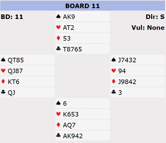 I dag se vi på et spill fra en lagturnering i helgen hvor det ble et ekkelt valg i spilleføringen for dem som fant fem til den gode slemmen 6 kløver med disse kortene: