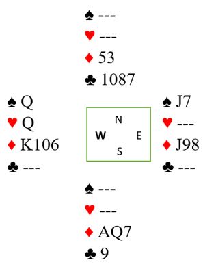 Vest er altså innspilt bare for å måtte spille majorfarge til dobbeltrenons som stjeles hos syd mens en ruter forsvinner fra nord, eller spille ruter til saksen. Den spilleføringen gjør at man "går seg" bet om øst har Q-J-x i hjerter og derfor kommer inn, og vest har ruter konge. For spilles sånn har jo spillefører kastet unna sin fjerde hjerter som kunne blitt til det tolvte stikket. Fordelen med denne spilleføringen er dog at det gir kontrakt hver gang vest har minst firekorts hjerter, for har vest det må det bli han som vinner stikket i tredje hjerterrunde.