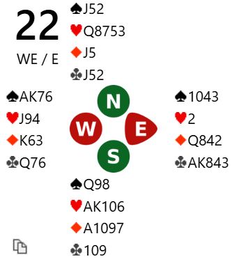 Om N/S er med til 2 hjerter kan Ø/V kjempe videre med 3 kløver, men de er i faresonen. Gjør de det blir det kanskje +110 uansett, men det er ikke umulig at N/S (syd) er med til 3 hjerter. Det står akkurat i 2 hjerter. De som fikk spille 2 hjerter med åtte stikk noterte 77%. Om N/S hadde vært i 2 hjerter og Bakke-Grude fått presset N/S opp i 3 hjerter ville en bet gitt Ø/V litt over 60% på spillet.