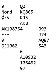 N/S kan vinne ti stikk i hjerterkontrakt. Så å være med til 5 hjerter er bra mot 4 spar som ikke kan rokkes, i sparutgang eventuelt doblet blir det ti stikk med beste motspill, ellers elleve stikk.