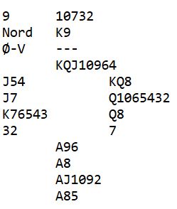 Joda, N/S kan vinne 4 hjerter. Det er kun en spartaper en rutertaper og så må kløveren løses med bare en taper. Det blir to tapere i den fargen om esset spilles først, men siden en har kløver 10 og 9 bør en spille på dobbelfinesse over øst som har åpningskort. Enten kløver knekt eller konge hos åpneren er veldig sannsynlig.