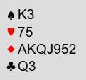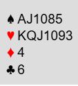 Over til Levins situasjon. Han hadde åpnet med 1 ruter før det altså gikk 4 hjerter fra syd og pass-pass fra de to neste. Han satt med: