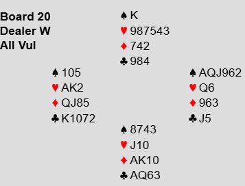 Hvis vest har hjerter ess får du senere prøvd sjansene i tur og orden. Om øst kommer inn på hjerter ess og spille spar får vi valget litt for tidlig, og det må gjettes om sparfinessen skal tas nå (50%), eller om en skal gå opp og satse på ruteren 3-3 (36%). Kanskje du bør teste ruteren før du spiller hjerter? Nei, for det kan føre til at den med fire ruter får godspilt ett ruterstikk som kan cashes idet hun kommer inn på hjerter ess.