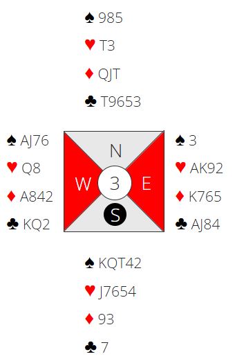 La oss si nord spiller ut kløver. Spillefører gir bort ett ruterstikk og har altså 11 sikre. Kanskje skifter de til spar til damen og esset. Så tas ruterstikkene fulgt av resten av kløveren. Før den siste kløveren fra øst ser det slik ut: