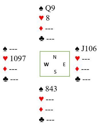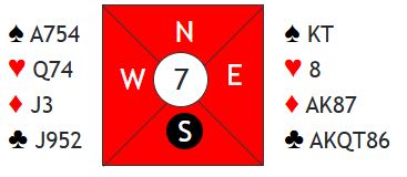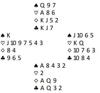 Hvis utspillet er fra knekten tredje må spillefører suse på med damen som i så fall vinner stikket. Skjer det blir det (minst) elleve stikk i 3NT. Legges liten hjerter og det sitter slik i hjerter vinner nord for knekten og spiller hjerter til syds ess. Damen faller, og N/S får seks hjerterstkk - to bet i 3NT i et spill hvor 6 kløver er så godt som nedlegg!