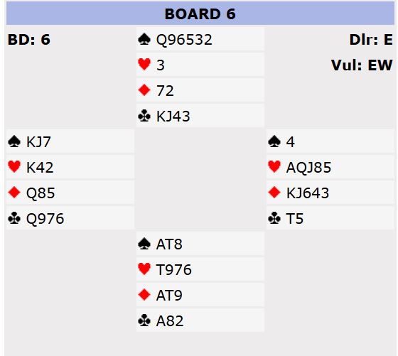 Her er et spill fra lagturneringen hvor undertegnede valgte feil spilleplan, og dermed hadde jeg egentlig spilt bort kontrakten sånn som det satt. Men det ordnet seg likevel på en morsom måte, dog med litt hjelp fra motparten.