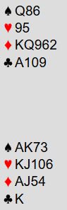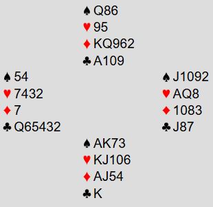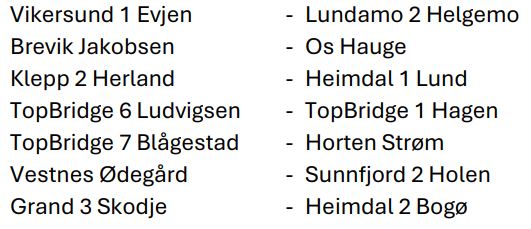 Dermed fikk Ø/V spille 5 hjerter, og da nord prøvde å ta kløverstikk ble det tolv stikk; Rogaland +480, og spillet ga dermed 13 IMP til Midt Trøndelag 1.