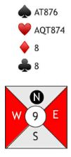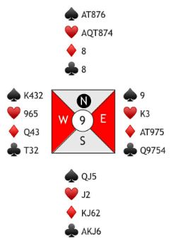 Løsning: Etter to runder trumf, spill ruter knekt som trumfes hos nord. Ett sparstikk må tapes uansett, så gi bort det stikket med liten fra begge hender. En av dem kommer inn og spiller spar tilbake til esset. Så trumfes den tredje sparen. Her er resten av kortene om det fra start sitter sånn som i vårt fullstendige diagram: